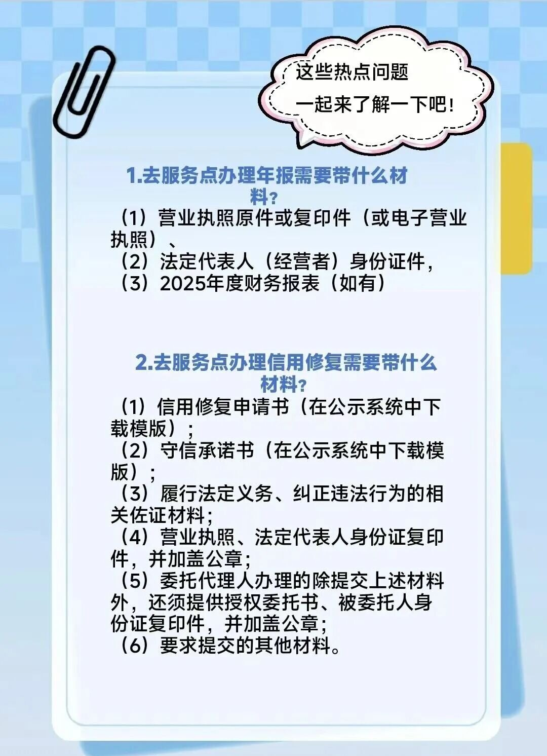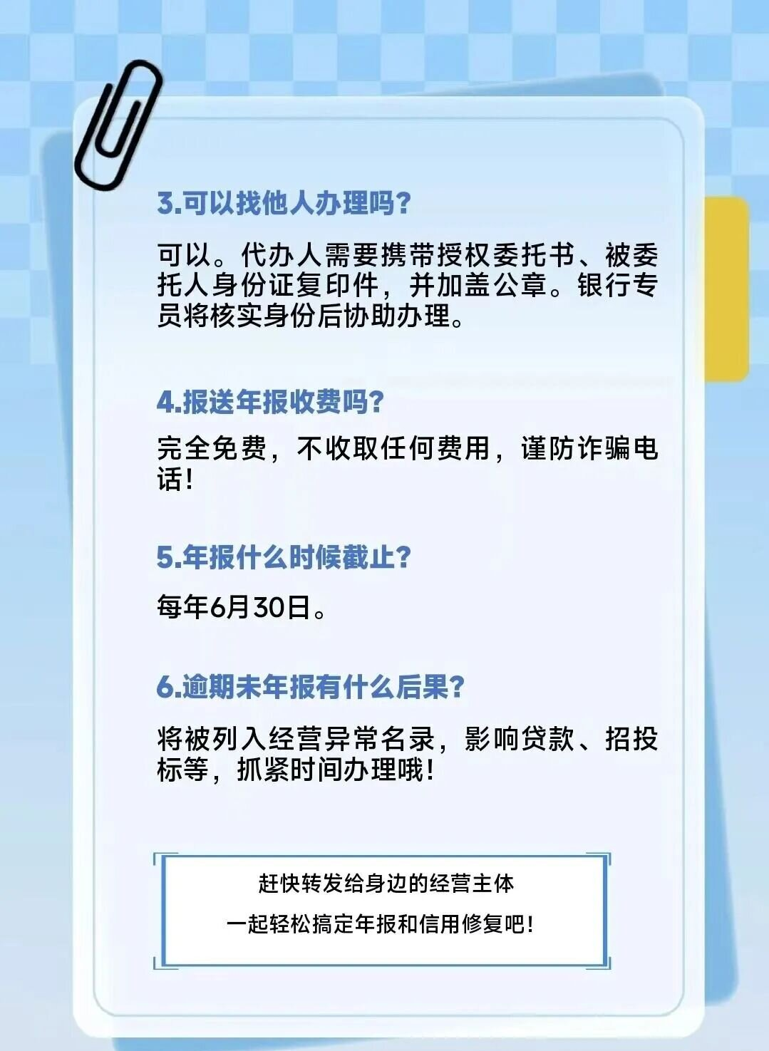 支持委托代办业务,经营主体可委托他人前往服务点办理年报或信用修复,代办人仅需携带加盖公章的授权委托书、身份证复印件等材料,经银行专员身份核实后即可协助办理,最大限度满足经营主体多样化的办事需求。