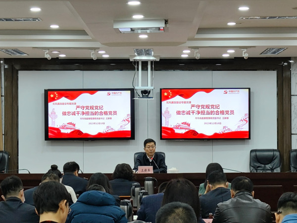 为推动学习贯彻习近平新时代中国特色社会主义思想主题教育走深走实,进一步在营造担当作为、干事创业的鲜明导向,筑牢全体党员干部廉洁自律防线,12月18日,巴彦淖尔市市场监督管理局组织举办了党风廉政建设专题党课活动,市局党组书记王新春同志为党员干部讲授了一堂精彩生动专题党课,所属各党支部班子成员、局机关副科以上党员干部职工70余人聆听了廉政党课。