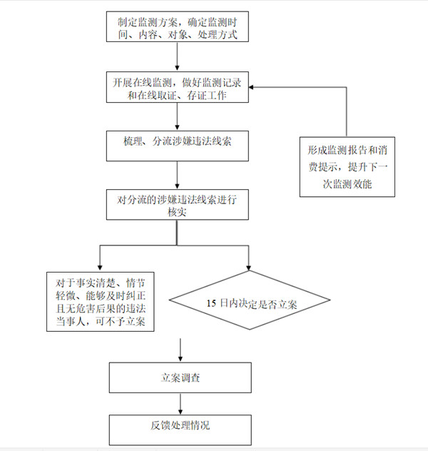 依托现有“监测平台 ”网络监测流程主要包括:制定监测方案,确定监测时间 内容、对象、处理方式;进行网上 检查、记录、先期在线提存证据;按辖区分流涉嫌违法线索;线索核查,依法处置,反馈处理情况;制作监测报告和消费提示等。
