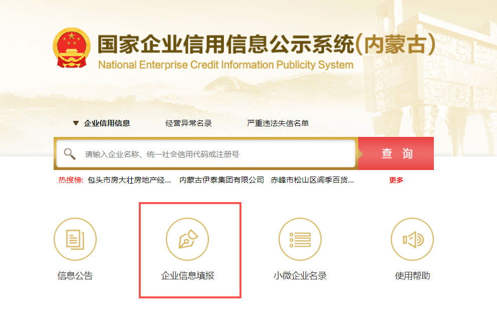 1.登录国家企业信用信息公示系统(网址为:https://shiming.gsxt.gov.cn/index.html)。点击“企业信息填报”。