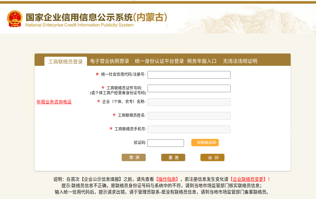 2.通过工商联络员登录,输入统一社会信用代码、工商联络员证件号码,获取手机验证码登录系统。