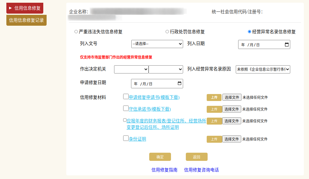 4.填报提交信用信息修复所需的信息和相关材料。填报完成并提交后,数据同步到业务系统,由登记管辖的市场监管部门受理。