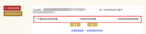3.企业完成系统登录后,点击“信用信息修复”,进入信用信息修复申请界面,选择要修复的类型。