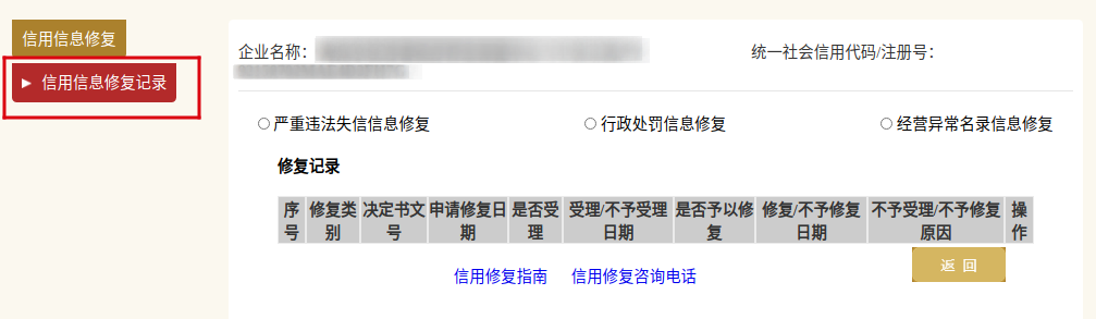 5.点击信用信息修复记录,可以查看提交的信用信息修复记录状态,是否受理、是否予以修复。