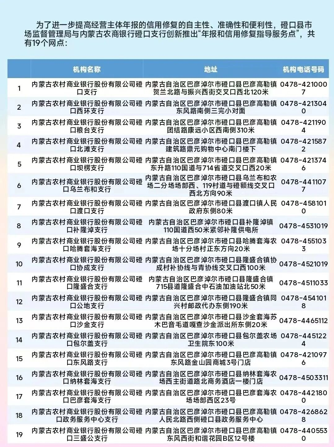 打破市场监管所政务服务空间限制,依托内蒙古农商银行磴口支行19个网点布局优势,将年报和信用修复指导服务延伸至乡镇苏木基层一线,实现县域服务网点全覆盖,让经营主体在家门口就能享受到专业的年报和信用修复指导服务,彻底解决“跑远路、找窗口”的问题。